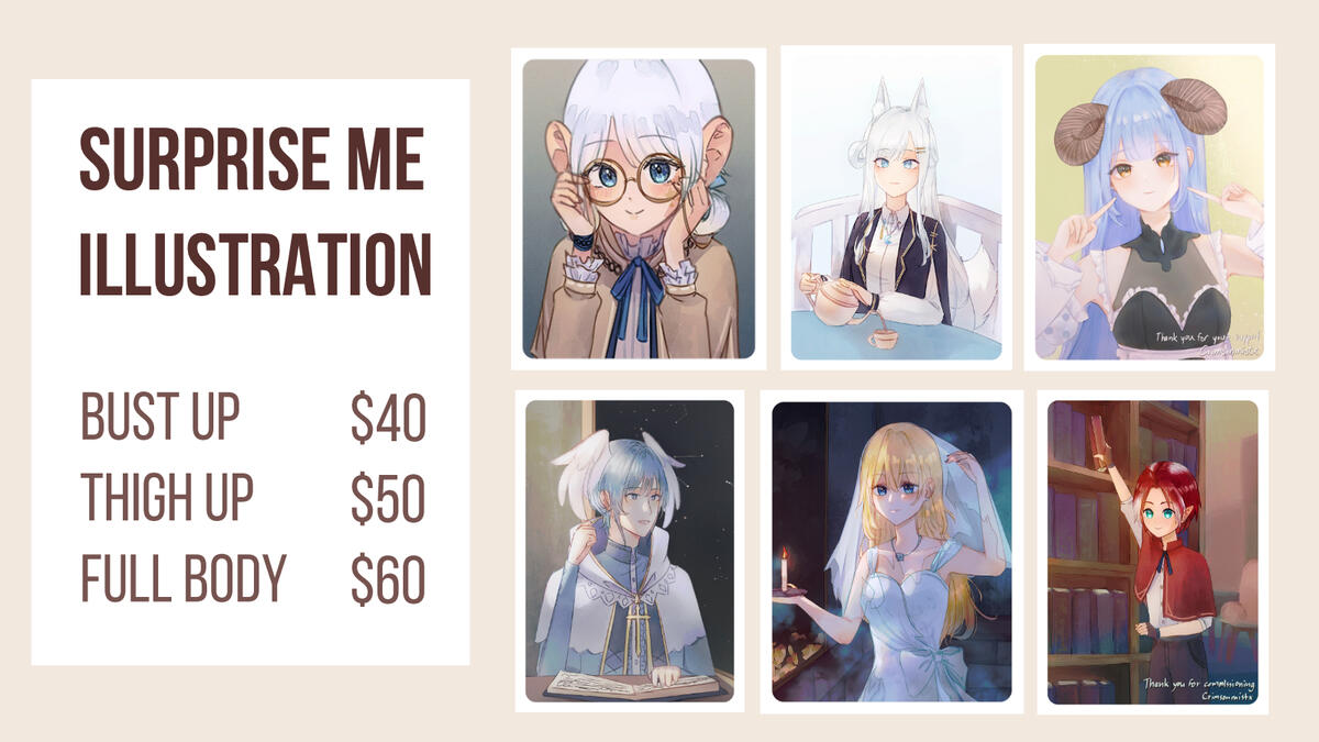 *For Surprise me commissions, there will be no communication between the client and the artist. Only one revision for correcting mistakes is available.IP RIGHTS
